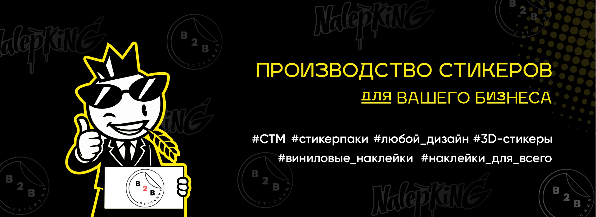 У нас вы можете заказать наклейки на любой вкус и для любых целей! Мы производим стикеры под своей торговой маркой NalepKiNG, а также предлагаем услуги создания стикеров под вашей торговой маркой (СТМ), стикеры «под заказ» для решения индивидуальных задач вашего бизнеса.